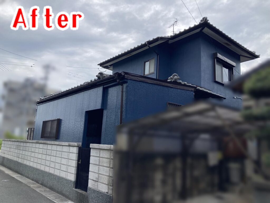外壁塗装後は、深みのあるブルー系の色合いに生まれ変わりました。