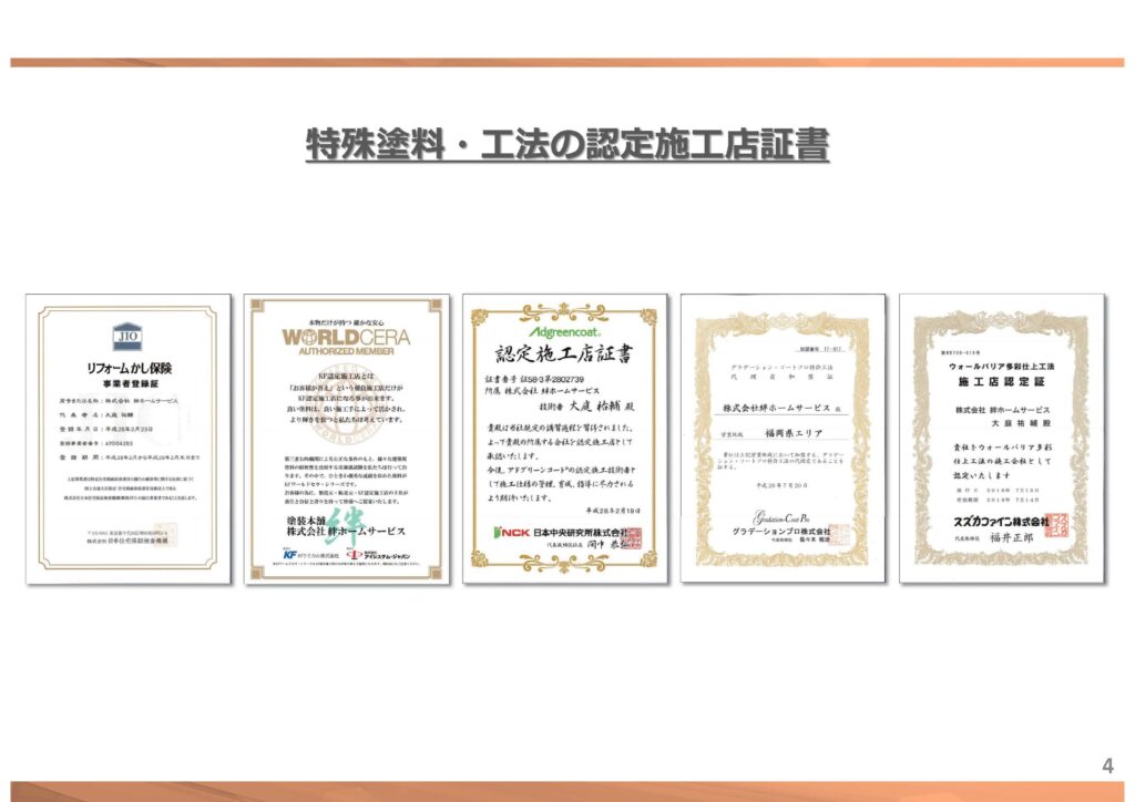 特殊塗料 ・ 工法の認定施工店証書 | 福岡県 直方市 の 塗装本舗 絆ホームサービス